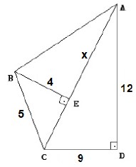 Considere os três triângulos e as medidas representadas na figura abaixo. Apenas os triângulos ADC e BEC são triângulos retângulos. Dessa forma, determine a medida do segmento AE.