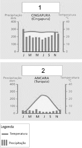A partir dos climogramas apresentados, é correto afirmar que 1 e 2 se referem, respectivamente, aos climas