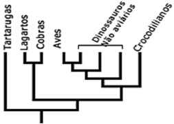 A escola de classificação filogenética considera que a diversidade dos seres vivos é resultante de processos evolutivos. Nesse contexto, o cladograma é uma ferramenta usada na reconstrução da história evolutiva das espécies. Os cladogramas são construídos a partir de três elementos básicos: os clados, organismos sobre os quais deseja-se compreender as evolutivas; as linhas, que representam o tempo evolutivo; e os nós, que representam ancestrais comuns para todos os grupos que estão acima dos nós. A escola de classificação filogenética considera como táxons válidos aqueles que compartilham um ancestral comum exclusivo. O esquema a seguir mostra um exemplo de cladograma.