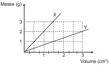 O gráfico a seguir representa a variação da massa de dois materiais, X e Y, em função de seus volumes.