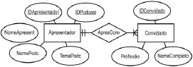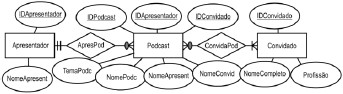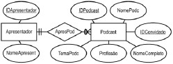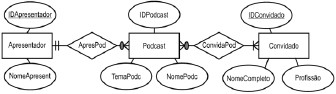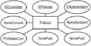 Uma plataforma de streaming de podcast registra o tema e o nome dos podcasts. Também são registrados os nomes dos apresentadores, além do nome e a profissão dos convidados. Cada entidade possui um identificador único.
