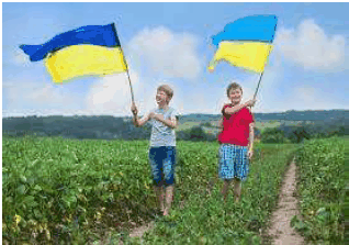Na imagem abaixo, meninos balançam bandeiras com duas faixas horizontais nas cores amarela e azul. Essas bandeiras representam que país?