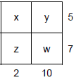 Os números reais x, y, w e z foram colocados no quadriculado 2×2, conforme a figura abaixo, de forma que as somas das linhas e colunas sejam como indicadas nas margens.
