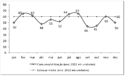O gráfico a seguir apresenta a evolução de consumo e o estoque médio de um tipo de cilindro de gás.
