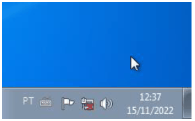 Uma pessoa, usando um computador com Windows 7 em sua configuração padrão, assiste a um vídeo de um curso de informática no YouTube, através do navegador Google Chrome. Em determinado momento, o vídeo trava. A pessoa tenta, então, recarregar a página e acessar outros websites, sem sucesso. Logo em seguida, nota algo no canto inferior direito da área de trabalho, que é reproduzido na imagem a seguir: