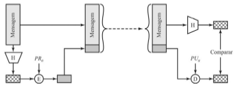 No cenário hipotético a seguir, em que as letras H, E e D designam, respectivamente, hash, emissor e destinatário, deseja-se usar criptografia com o objetivo de criar uma assinatura digital do emissor, de modo que o destinatário tenha certeza de que a mensagem foi assinada pelo emissor.