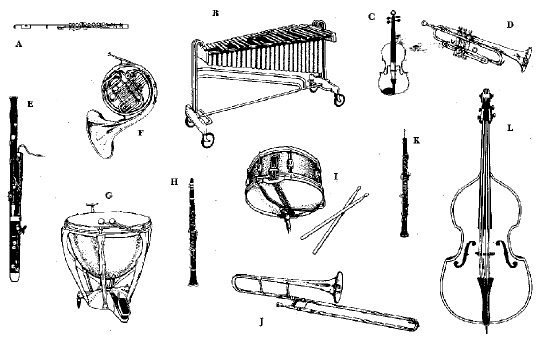 A – Flauta; B – Xilofone; C – Violino; D – Trompete; E – Contrafagote; F – Tuba; G – Tímpano; H – Clarim; I – Bombo; J – Trompete tenor; K – Cone inglês; L – Violoncelo.