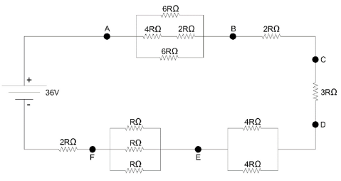 Uma forma de controlar a passagem da corrente elétrica em um circuito é por meio da associação de resistores, seja em série, ou em paralelo. A imagem traz um esboço de um circuito elétrico DC composto por 12 resistores com resistências em função de R, alimentados por uma fonte de tensão de 36 V .