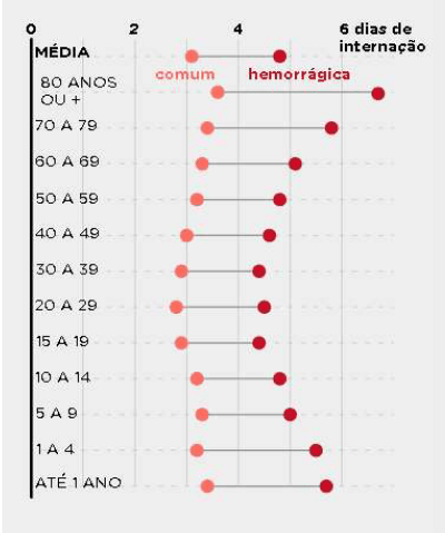 I.A dengue hemorrágica requer em média mais dias e internação hospitalar, independentemente da faixa etária.