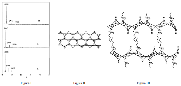 Os difratogramas A, B e C, representados na figura I, correspondem a AlPO-ntu sintetizado, respectivamente, com n-butilamina, n-hexilamina e n-octilamina.