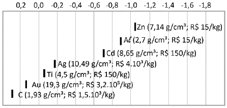 Alguns aviões empregam fibra de carbono em uma porcentagem significativa de suas estruturas, tornando-as muito menos densas. Partes da estrutura, no entanto, são compostas por metais. Devido à baixa densidade, o alumínio seria uma boa alternativa de metal a ser usado. Entretanto, quando em contato com fibra de carbono, o alumínio é corroído. Esse processo é denominado corrosão galvânica e acontece quando dois materiais que possuem potencial elétrico diferentes são colocados em contato com um eletrólito, como uma solução salina. Para abordar esse problema, pode-se avaliar os potenciais elétricos, densidade e preço aproximado de diversos materiais apresentados na figura a seguir.