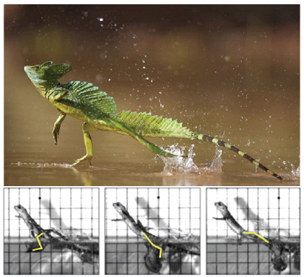 Os lagartos do gênero Basiliscus têm a capacidade incomum de correr sobre a água. Essa espécie possui uma membrana entre os dedos que aumenta a área superficial de suas patas traseiras. Com uma combinação de forças verticais de suporte e forças horizontais propulsivas geradas pelo movimento de suas patas na água, o lagarto consegue obter impulso resultante para cima e para frente, conforme figura a seguir.