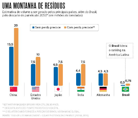 Um relatório feito pela Agência Internacional de Energia Renovável (Irena) em 2016 sobre o gerenciamento dos painéis solares fotovoltaicos ao fim de sua vida útil alerta que a quantidade de lixo anual no começo dos anos 2030 atingirá algo entre 1,7 milhão e 8 milhões de t. Em 2050, esse tipo de resíduo poderá chegar a 78 milhões de t no planeta.