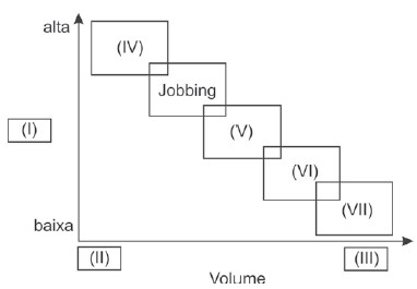 A matriz produto-processo é muito utilizada para mostrar a relação entre características do produto e seus impactos sobre o layout, a divisão do trabalho e o fluxo de materiais, dentre outros aspectos. A versão clássica desta matriz para processos de manufatura está representada abaixo.