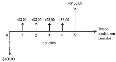 O gráfico abaixo mostra o fluxo financeiro associado a um determinado investimento. As despesas são representadas por setas para baixo, a partir do eixo do tempo, e seus valores têm sinal negativo. Os recebimentos são representados por setas para cima e seus valores têm sinal positivo.