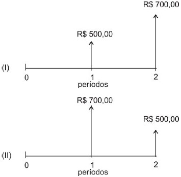Um investidor aplica R$ 1.000,00 e recebe pagamentos resultantes da aplicação após 1 e 2 períodos, conforme duas alternativas representadas pelos dois perfis, (I) e (II), mostrados nos gráficos abaixo.