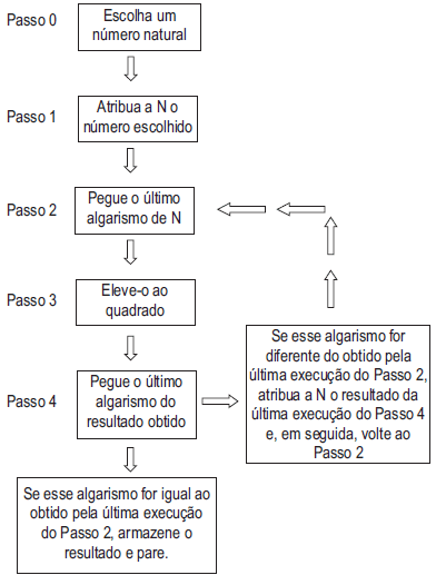 Abaixo é dado um algoritmo. Para que o algoritmo tenha início, escolhe-se um número natural e, a seguir, executa-se sucessivamente cada um dos passos descritos. Durante a execução do algoritmo, é necessário o uso de uma variável que chamaremos de N.