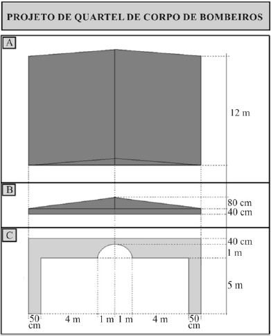 A figura anterior apresenta diferentes partes do projeto de um quartel, em que A corresponde à vista superior do telhado, B corresponde à perspectiva frontal do telhado, e C corresponde à fachada do prédio.