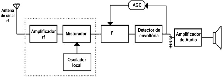 A ideia básica do sistema é que uma emissora qualquer, centrada na frequência fc seja captada pela antena e tenha seu sinal amplificado pelo amplificador rf na entrada. O misturador, através do oscilador local, ajusta a frequência fLO de tal maneira que apenas a referida emissora “atravesse” o filtro seletivo com frequência fIF. Para que este princípio básico seja satisfeito, a correlação destas frequências deve ser