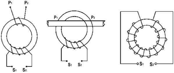 Observe os diferentes tipos construtivos de Transformadores de Corrente (TCs):