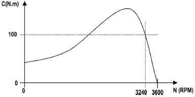 Pode-se considerar que em sua região de operação nominal, N > 3240 RPM, tem-se um fator de potência de 0,85 indutivo e um rendimento de 92%. Além disso, pode-se considerar que a correlação Conjugado x Velocidade pode ser aproximada de forma linear. Suponha que se acople uma carga mecânica ao eixo desta máquina, de maneira que sua velocidade se estabiliza para um valor N1 com um escorregamento de 2%. Pode-se aproximar o valor do conjugado C para velocidade N1 como