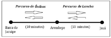 Determinada empresa de turismo oferece um passeio para turistas que visitam a cidade de Camaçari. O passeio inicia na praia da Barra do Jacuípe, passa pelas praias de Arembepe e de Jauá, de onde ocorre o retorno para a Barra de Jacuípe. O tempo de deslocamento, de ida e volta, entre essas praias é mostrado na figura a seguir. Na praia de Arembepe há uma parada de exatos 10 minutos; na praia de Jauá, o tempo de parada é de exatos 20 minutos; na volta do passeio, há uma nova parada em Arembepe de exatos 20 minutos.