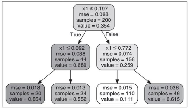 Nesse contexto, considere a construção de uma árvore de regressão usando a classe DecisionTreeRegressor do Scikit-Learn e seu treinamento em um conjunto de dados quadrático com max_depth=2, conforme mostrado a seguir: