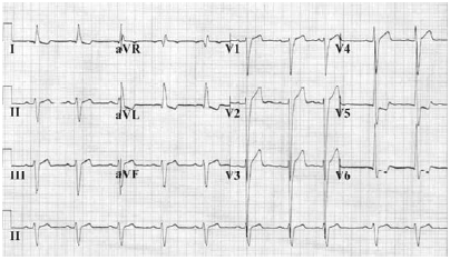 Uma paciente de 46 anos de idade, com diagnóstico de síndrome do túnel do carpo, hipertensão arterial sistêmica (HAS) e diabetes do tipo 2 (DM2) havia quatro anos, estava em uso regular de anlodipino, enalapril, hidroclorotiazida, metformina, sitagliptina e glicazida nas doses máximas preconizadas. Ela relatou cefaleia, sonolência diurna, roncos e dificuldade para manter a atenção no seu ambiente de trabalho no último ano. No exame físico, apresentava circunferência abdominal de 96 cm, pressão arterial de 164 mmHg × 96 mmHg (média de três medidas) e frequência cardíaca de 72 bpm. Os demais achados do exame físico foram normais. Exames laboratoriais da paciente revelaram os seguintes resultados: triglicerídeos de 203 mg/dL; colesterol total de 251 mg/dL; HDL colesterol de 34 mg/dL; LDL colesterol de 171 mg/dL; glicemia de jejum de 169 mg/dL; e hemoglobina glicada de 8,8%. Os demais exames laboratoriais de rotina não revelaram anormalidades significativas. O resultado do eletrocardiograma é mostrado a seguir.