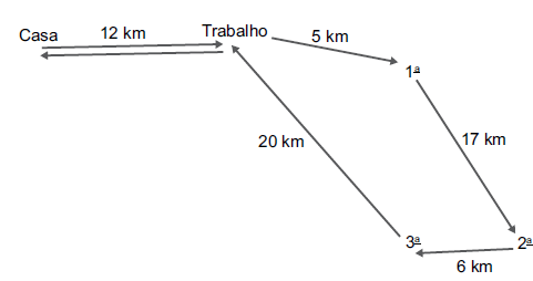 O motorista de uma ambulância reside a 12 km de seu local de trabalho. Na quinta-feira, ele atendeu três ocorrências: a primeira a 5 km do local de trabalho, a segunda de 17 km a partir da primeira, e a terceira de 6 km a partir da segunda. Ao final da terceira ocorrência, percorreu 20 km até voltar ao local de trabalho e 12 km até chegar em casa, conforme figura a seguir.