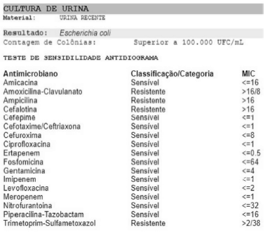 Com base no antibiograma precedente, apresentado por um paciente, julgue o item a seguir.