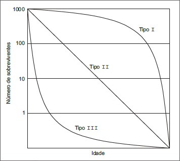 Os três tipos básicos teóricos de curvas de sobrevivência das espécies estão representados na figura abaixo.