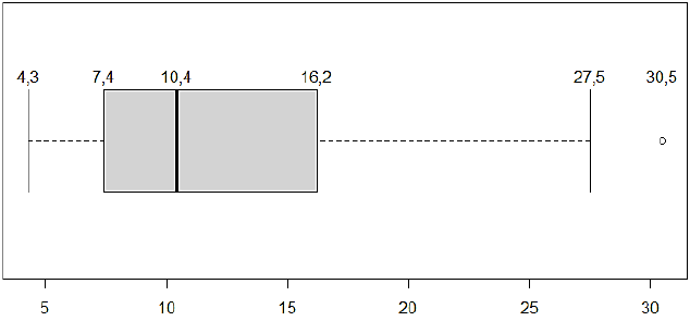 Analise o gráfico de caixa abaixo, em que os valores de cada elemento estão apresentados para facilitar a interpretação: