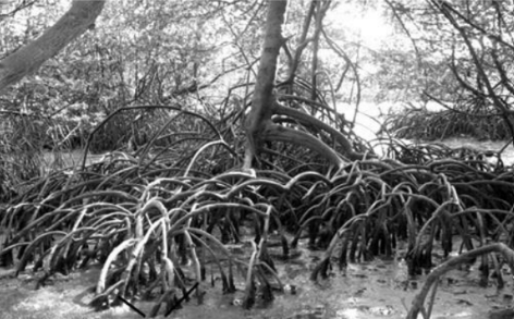 A imagem mostra uma espécie nativa dos mangues de Vitória, a Rhizophora mangle, que apresenta um sistema de estruturas aéreas em forma de arco, denominadas rizóforos.