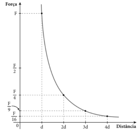 A intensidade (F) da força de atração gravitacional entre dois corpos de massas mA e mB varia em função da distância d entre seus centros de gravidade.