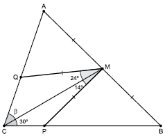 Em um triângulo ABC, o ponto M divide o lado AB em duas partes de mesma medida, e os pontos P e Q estão sobre os lados desse triângulo, de modo que MP = MQ = MA, conforme mostra a figura.