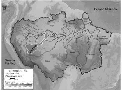 Considerando a figura precedente, que apresenta a extensão da bacia territorial do rio Juruá, a qual ocupa aproximadamente 49% do território do Acre, assinale a opção correta.