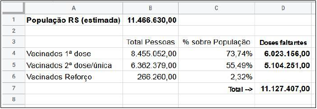 Deseja-se calcular quantas doses ainda faltam para vacinar 100% da população (estimada), que está na célula B1, com as 2 doses, sem considerar doses de reforço. Sabe-se que, pelos protocolos atuais, não se pretende vacinar toda a população, mas para este cálculo vai ser considerada, apenas como hipótese, a vacinação de 100% da população estimada. A planilha, produzida no Google Planilhas, ficaria como segue.