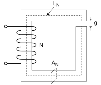 A figura abaixo apresenta um indutor com as seguintes características: área de seção transversal do núcleo A_N = \frac{1}{\pi}\, cm^2, comprimento médio do núcleo L_N = 20 \, cm, permeabilidade relativa do núcleo magnético \mu_R = 2000 e número de espiras N = 100.