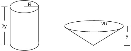 Em uma fábrica, há dois tanques, um no formato de um cilindro circular reto, com raio de base medindo R e altura medindo 2y, e outro no formato de um cone circular reto, com raio de base medindo 2R e altura medindo y, como indicado na Figura.