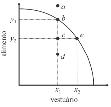 Com base na curva ou fronteira de possibilidades de produção em uma economia de dois produtos (alimento e vestuário), representada no gráfico precedente, julgue o próximo item.