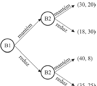 Em um pequeno país, há dois bancos que ofertam serviço de crédito. Um deles, B1, é o líder. O outro, B2, é seguidor, tomando decisões sempre após B1 publicar as próprias decisões. Ao analisarem a possibilidade de reduzir a taxa de juros que cobram de seus clientes, B1 e B2 chegaram ao jogo sequencial representado a seguir, em que os pay-offs representam o ganho anual esperado, em milhões de unidades monetárias do país, após ambos tomarem suas decisões, sendo a primeira coordenada o ganho de B1, e a segunda coordenada, o ganho de B2.