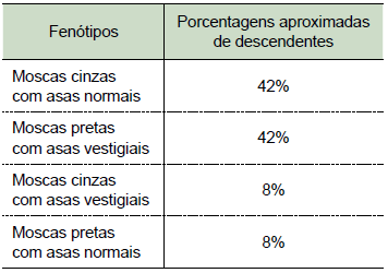 Em moscas-das-frutas (Drosophila melanogaster), a cor cinza do corpo do inseto é determinada pelo alelo dominante P, e a cor preta pelo alelo recessivo p. A forma normal das asas da mosca é determinada pelo alelo dominante V, e as asas vestigiais pelo alelo recessivo v. Realizou-se um experimento em que fêmeas duplo-heterozigotas foram cruzadas com machos de corpo preto e asas vestigiais. A tabela mostra os resultados desses cruzamentos.