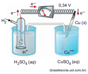 O arranjo experimental mostrado na imagem representa uma célula eletroquímica (pilha) usada na obtenção do potencial padrão de redução (Eo) de semirreações, adotando-se Eo = 0 V para o eletrodo de hidrogênio. Atribui-se Eo positivo para o metal que reduz frente ao H e Eo negativo para o metal ou espécie que oxida.
