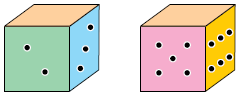 A face correspondente ao número 1 de um dado comum de seis faces foi apagada. O mesmo ocorreu com a face correspondente ao número 4 de outro dado comum de seis faces.