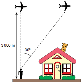 Um garoto, com o auxílio de um transferidor, tenta calcular a velocidade de um avião que passa por cima de sua casa. Esse garoto repara que o avião, que antes passava pela vertical, acima de sua cabeça, após 10 s está a 30º em relação a essa vertical, como representado na imagem.