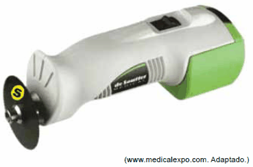 Uma equipe médica filma uma cirurgia ortopédica na qual foi utilizada uma serra óssea, com um disco que gira em torno de um eixo, como a da imagem.