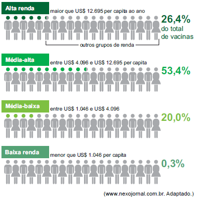 O infográfico apresenta a porcentagem do total de vacinas aplicadas em cada grupo de países, até agosto de 2021.