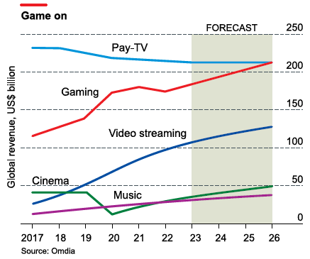 The bigger the audience, the bigger the market. Consumers will spend 185 billion dollars on games in 2023, more than half on mobile games. That is about five times the value of the cinema box office, and two-thirds more than the video-streaming business. As gaming continues to grow, it is beginning to rival television as the world’s favourite entertainment medium.