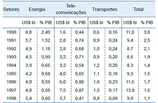Examine a tabela de investimentos em infraestrutura econômica no Brasil, no período de 1990 a 1998, com os volumes de capitais expressos em bilhões de dólares e suas respectivas proporções em relação ao Produto Interno Bruto (PIB).