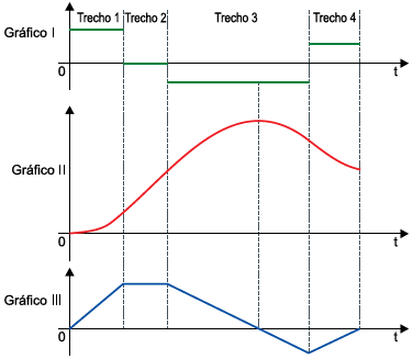 Os três gráficos, I, II e III, mostram como variaram, em função do tempo, três grandezas escalares associadas ao movimento desse veículo, sem identificá-las, nos quatro trechos descritos.